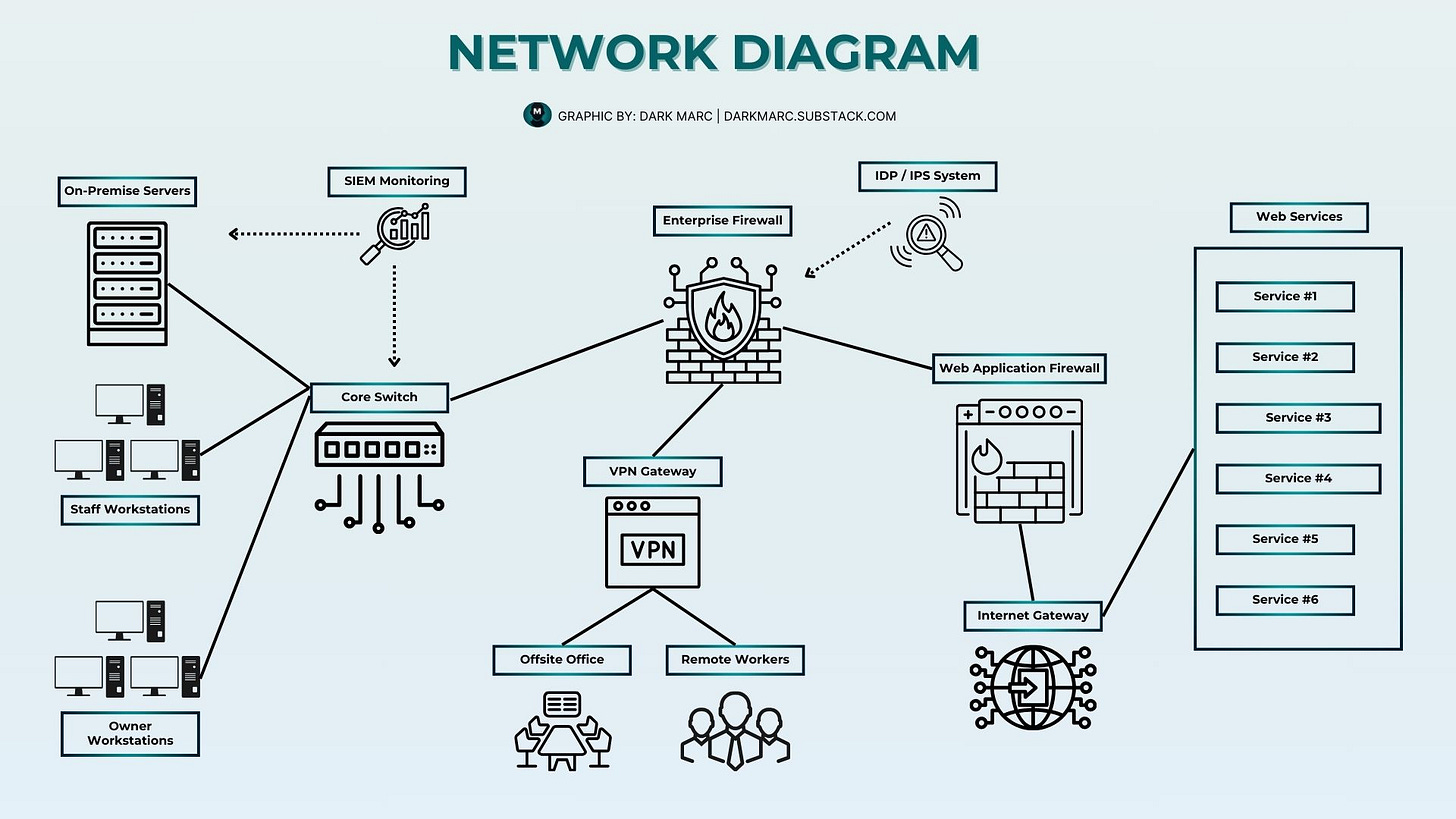 Alongside foundational computer networking concepts, the network diagram also highlights essential cybersecurity elements, which we will explore in greater detail later. For now, it's important to understand their placement within the overall network structure.