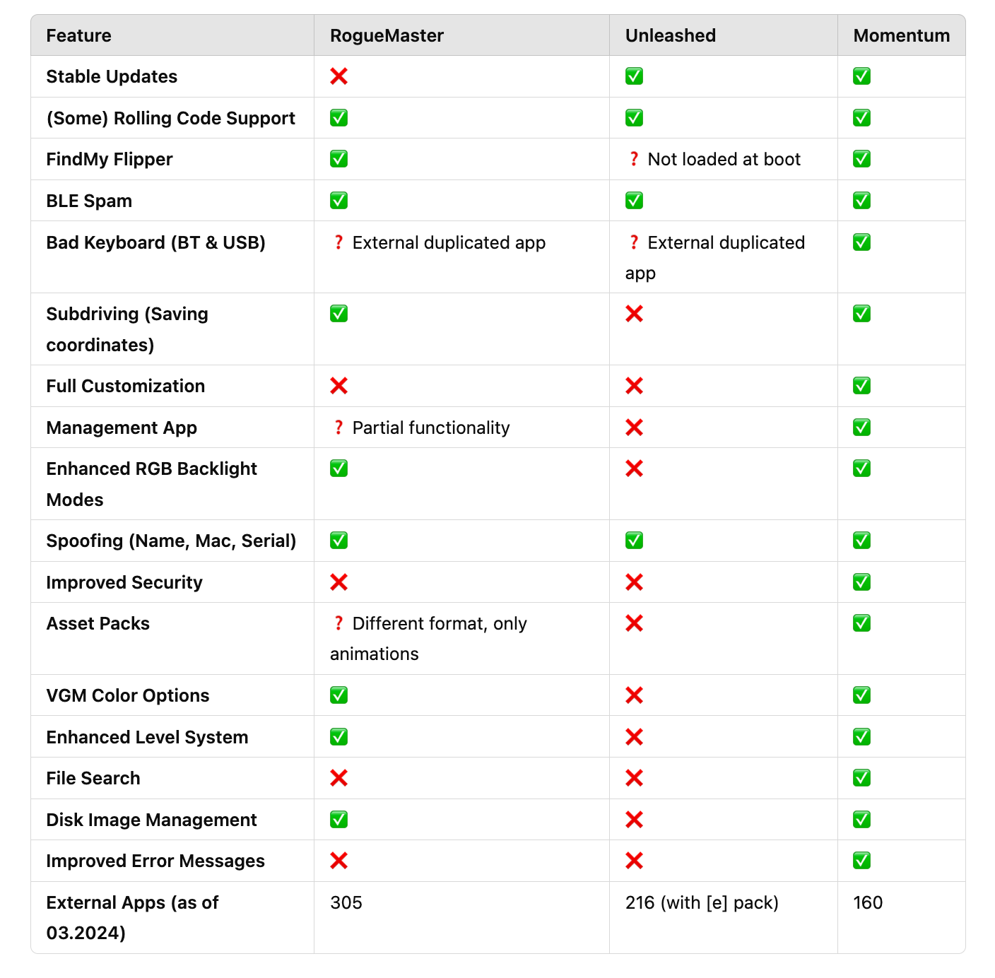 Momentum, released in May 2024, was created by former Xtreme firmware developers—a project known for unlocking most features but also for its instability. Born from a split between Xtreme’s core developers, Momentum’s future is uncertain, with stability being the trade-off for new features and faster updates.
