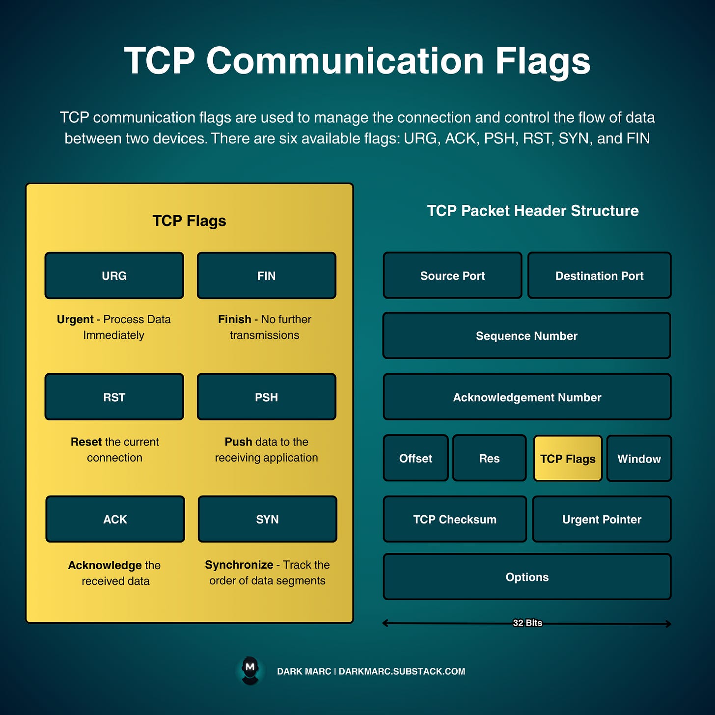 TCP flags are single-bit fields in the TCP header that act like switches - they're either "on" (1) or "off" (0). These flags tell the receiving computer how to handle the incoming packet and what state the connection should be in.