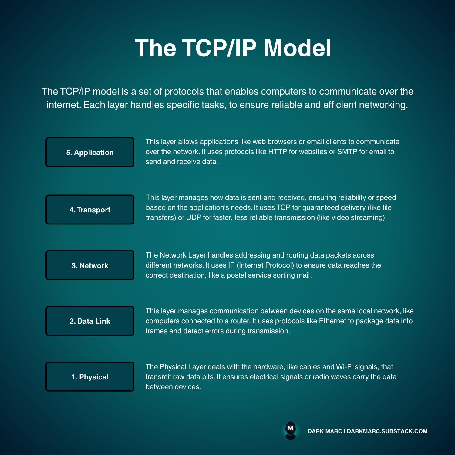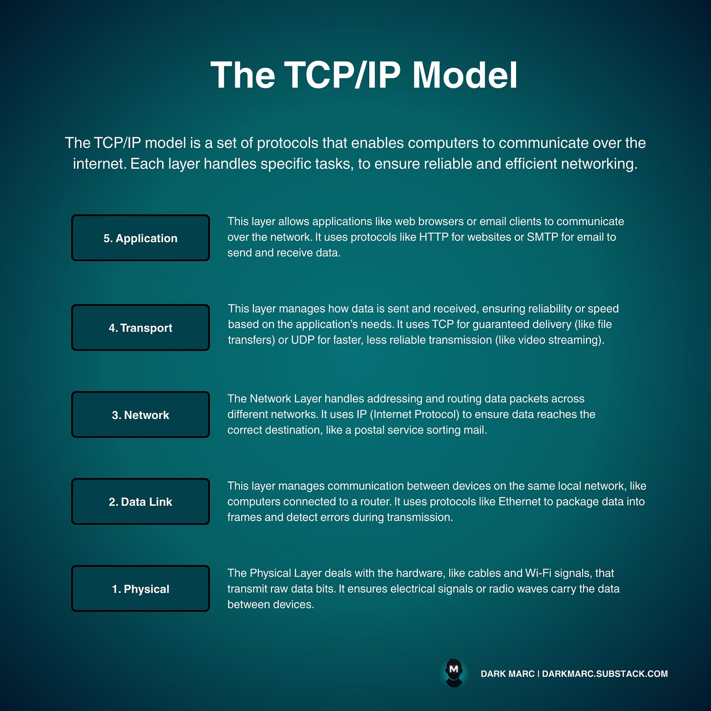 The TCP/IP Model is a framework that powers real-world network communication, like the internet. It has five layers and uses protocols built into devices and software to ensure data transfer.