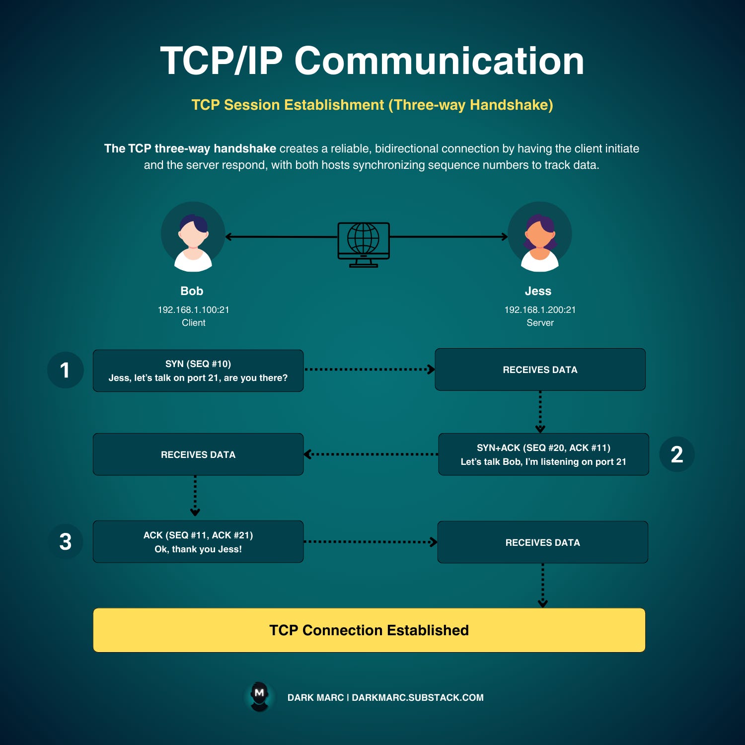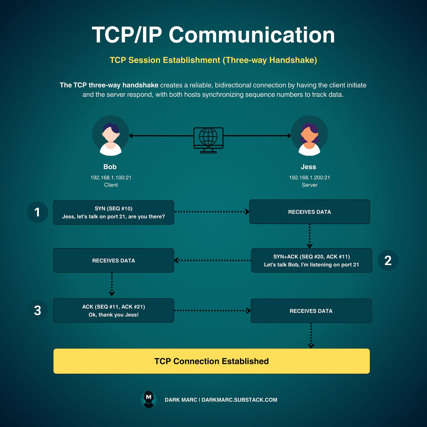After this handshake, both sides know each other's starting point for tracking data. Random sequence numbers prevent attackers from guessing and hijacking the connection.