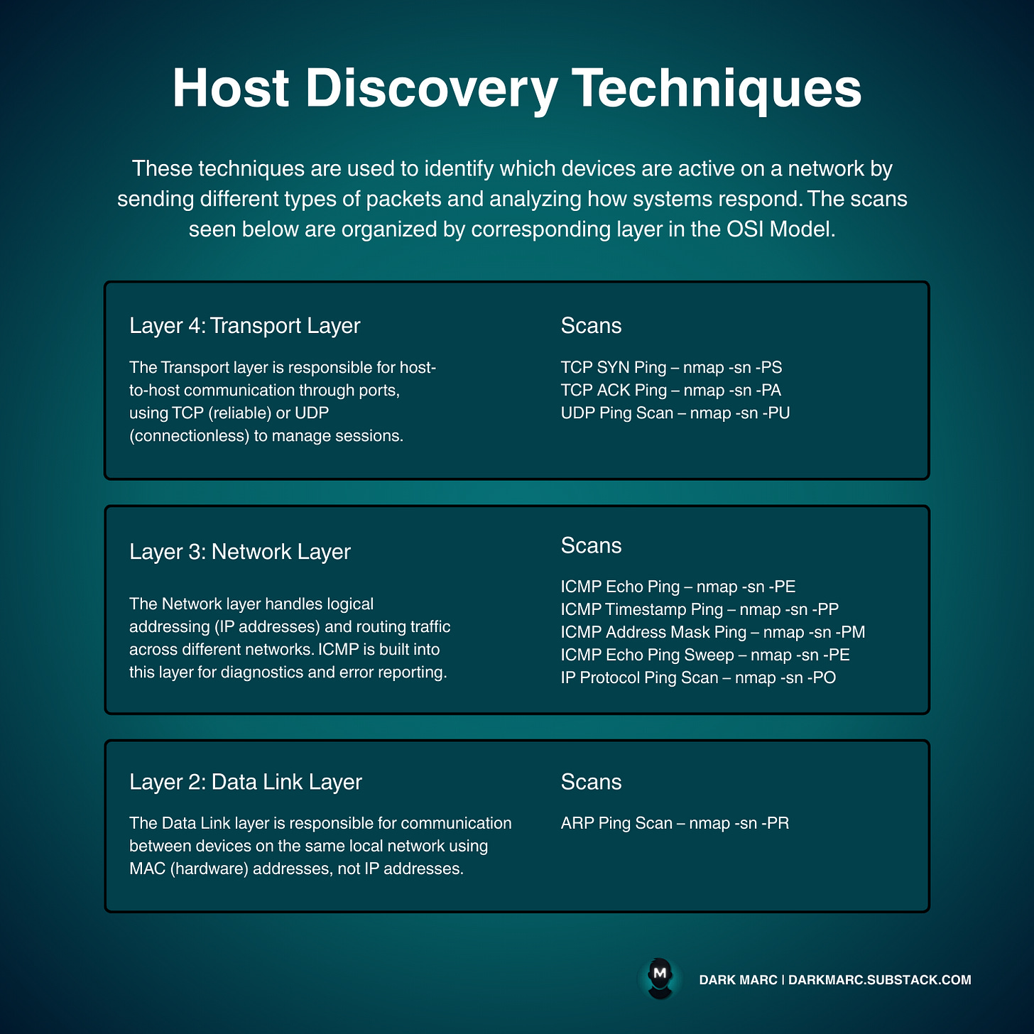 Host discovery techniques identify active systems on a network. These methods help map which devices are online before conducting detailed scans.