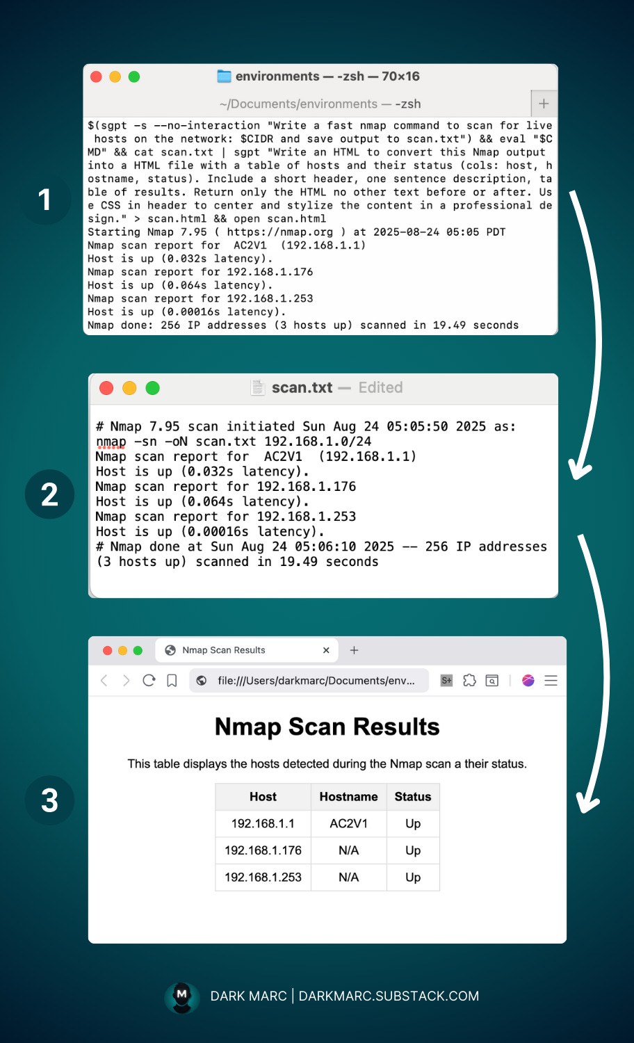 In the command, the options work together to obscure the scan’s origin, fragment packets for stealth, and utilize a commonly permitted source port to avoid detection: