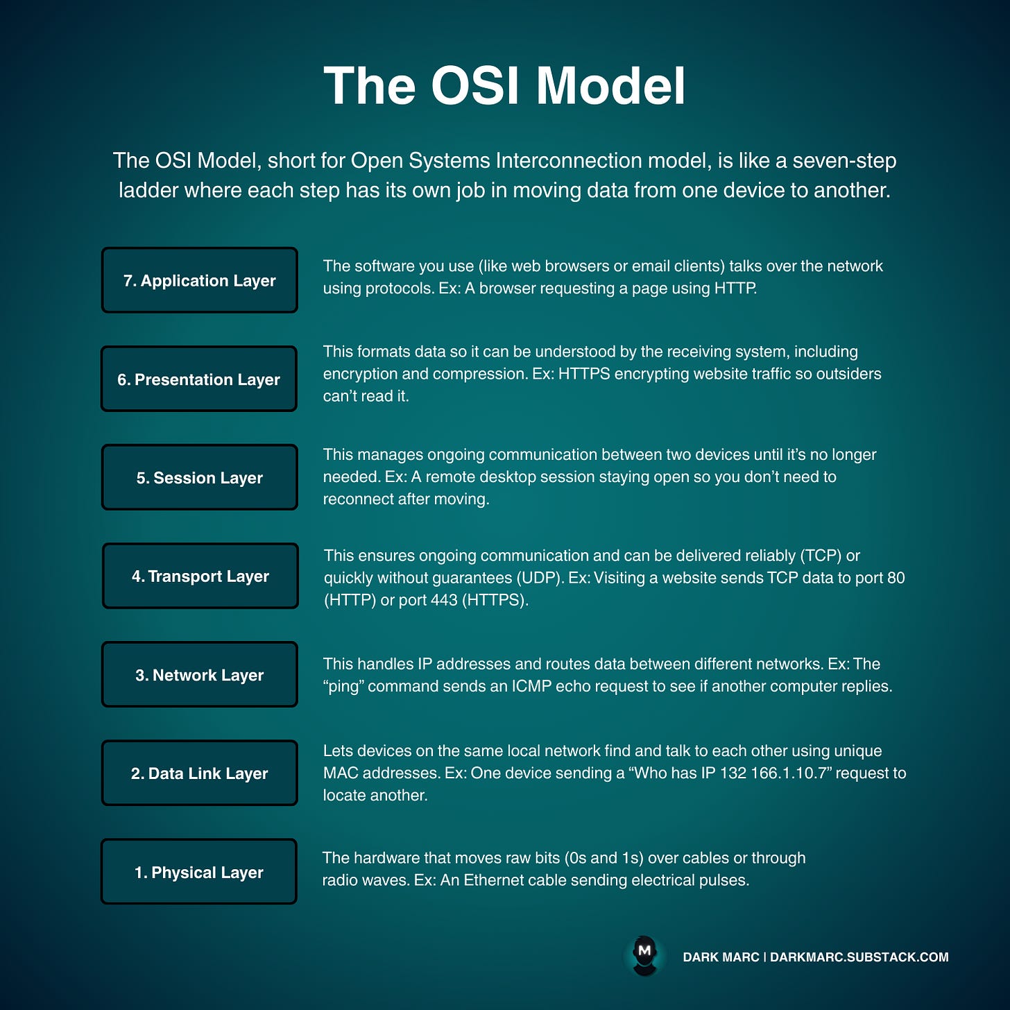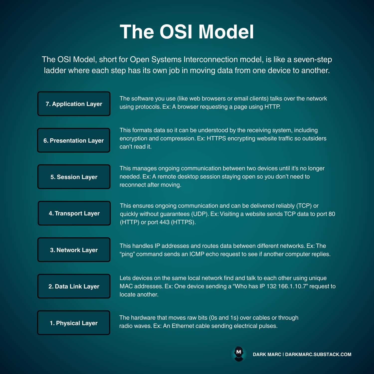 Data Link Layer: Enables devices on the same local network to communicate using unique MAC addresses. Example: an ARP request (“Who has IP 192.168.1.10?”) maps an IP to a MAC address. Scanning here can identify all devices on a local network.